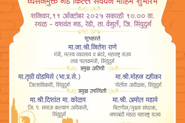 पालकमंत्री नाम. नितेश राणे यांच्या हस्ते शुभारंभ सिंधुदुर्ग प्रतिनिधी जिल्ह्याचे पालकमंत्री नितेश राणे यांच्या हस्ते ‘व्यसनमुक्त गड- किल्ले संवर्धन मोहिमेचा’ सिंधुदुर्गातून शुभारंभ होणार असून दिनांक ११ ऑक्टोबरला रेडी येथील यशवंतगडावर पालकमंत्री नितेश राणे आणि जिल्हाधिकारी तृप्ती धोडमिसे तसेच पोलीस अधीक्षक डॉ. मोहन दहिकर यांच्या उपस्थितीत या अभिनव उपक्रमाची सुरुवात करण्यात येणार आहे. सिंधुदुर्ग जिल्ह्यातील ऐतिहासिक…