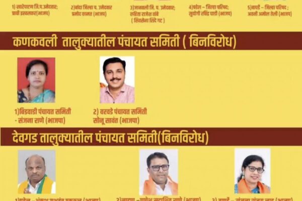 ५ जिल्हापरिषद आणि ६ पंचायत समिती सदस्य झाले बिनविरोध. कणकवली प्रतिनिधी सिंधुदुर्ग जिल्हा परिषद आणि पंचायत समिती निवडणुकीच्या रणधुमाळीत भाजप नेते तथा पालकमंत्री ना. नितेश राणे यांनी आपली राजकीय पकड पुन्हा एकदा सिद्ध केली आहे. खासदार नारायण राणे यांच्या नेतृत्वाखाली लढणाऱ्या महायुतीने निवडणुकीच्या सुरुवातीलाच मोठा धमाका केला असून, जिल्ह्यातील एकूण ११ जागांवर महायुतीचे उमेदवार बिनविरोध…