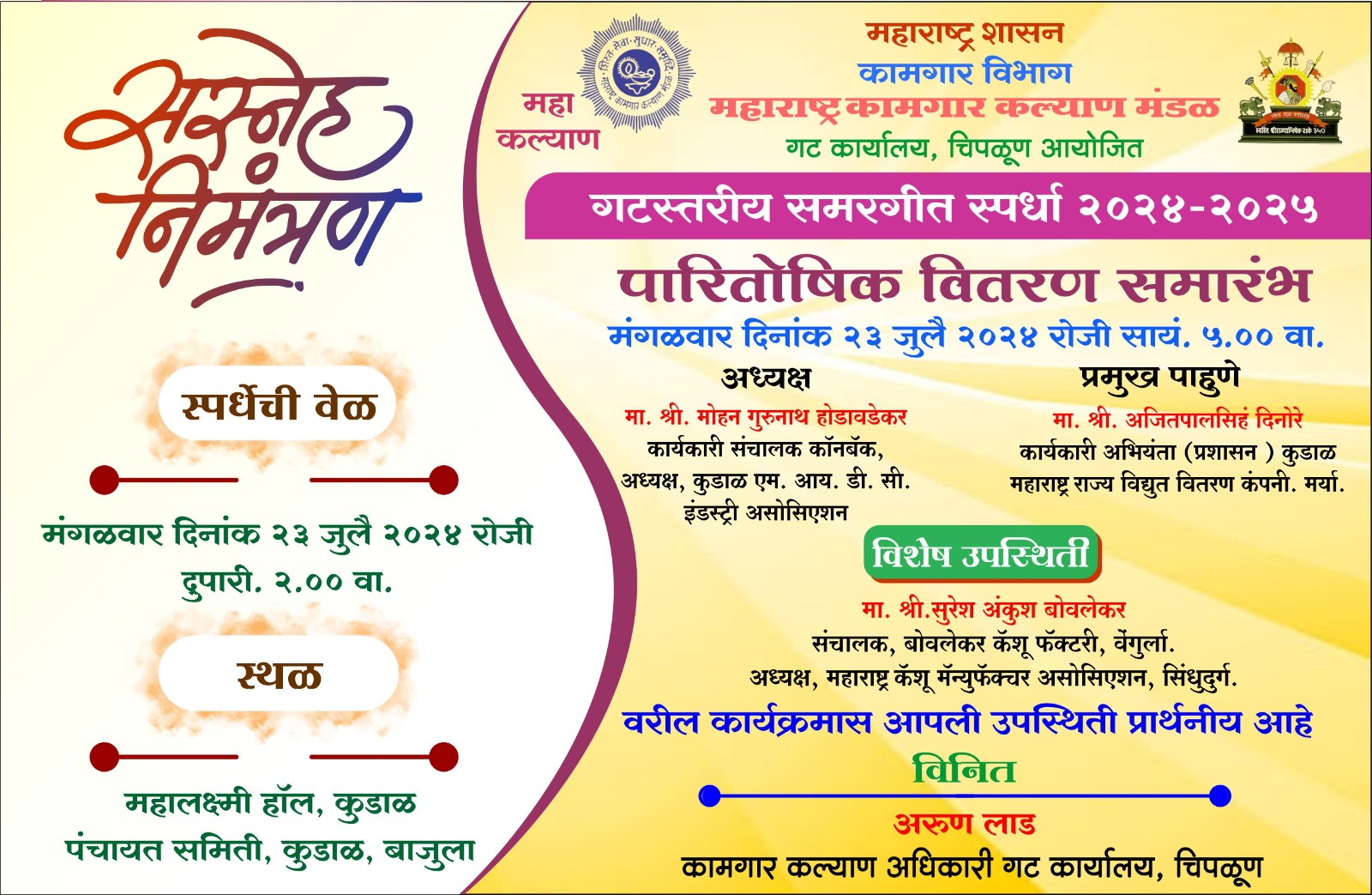 महाराष्ट्र कामगार कल्याण मंडळ गट कार्यालय चिपळूण आयोजित गटस्तरीय समरगीत स्पर्धा मंगळवार दिनांक २३जुलै २०२४रोजी दुपारी २:००वाजता महालक्ष्मी हॉल कुडाळ येथे स्पर्धेचे आयोजन करण्यात आले आहे. तसेच या स्पर्धेचे पारितोषिक वितरण समारंभ सायंकाळी ठिक ५:००वाजता संपन्न होणार आहे. या कार्यक्रमाला अध्यक्ष मा. श्री. मोहन गुरुनाथ होडावडेकर संचालक कॉनबॅक, कुडाळ एम आय डी सी इंडस्टी असोसिएशन व प्रमुख पाहुणे , अजितपालसिंह दिनोरे कार्यकारी अभियंता प्रशासन कुडाळ महाराष्ट्र राज्य विद्युत वितरण कंपनी मर्या. तसेच विशेष उपस्थितीत मा. श्री. सुरेश अंकुश बोवलेकर संचालक बोवलेकर कॅशू फॅक्टरी वेंगुर्ला, हे या कार्यक्रमासाठी उपस्थितीत राहणार आहे. तरी आपण जास्ती जास्त गटस्तरीय समरगीत स्पर्धेसाठी उपस्थितीत राहावे. असे आवाहन अरूण लाड कामगार कल्याण अधिकारी गट कार्यालय चिपळूण यानी केले आहे.