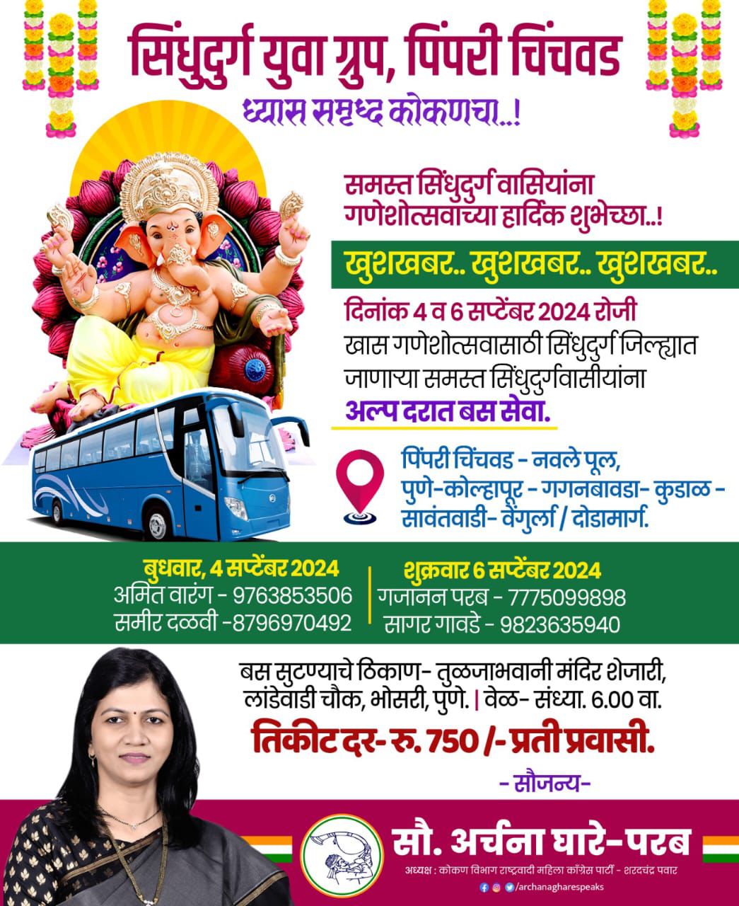 राष्ट्रवादी काँग्रेस शरदचंद्र पवार पक्षाच्या कोकण विभाग महिला अध्यक्षा सौ. अर्चना घारे-परब यांच्या सौजन्याने सालाबादप्रमाणे यंदाही सिंधुदुर्गवासियांसाठी ”अल्प दरात बस सेवा” उपलब्ध करून देण्यात आली आहे.सिंधुदुर्ग युवा ग्रुप, पिंपरी चिंचवड यांच्याद्वारे हा उपक्रम राबविण्यात येत आहे. पुणे येथून सुटणारी बस सावंतवाडी, वेंगुर्ला / दोडामार्ग तालुक्यापर्यंत येणार आहेत. गणेशोत्सवात सिंधुदुर्गात जाणाऱ्या जनतेची होणारी गैरसोय लक्षात घेऊन दरवर्षी हा उपक्रम राबविण्यात येतो. यंदाही खास गणेशोत्सवासाठी सिंधुदुर्ग जिल्ह्यात जाणाऱ्या समस्त सिंधुदुर्गवासीयांनी या उपक्रमाचा लाभ घ्यावा असे आवाहन सौ. अर्चना घारे-परब यांनी केले आहे.