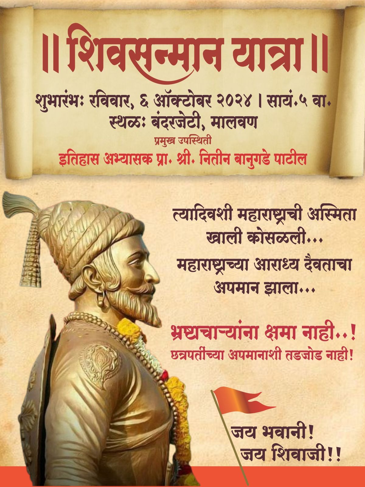 देशाचे पंतप्रधान नरेंद्र मोदी यांनी अनावरण केलेल्या मालवण तालुक्यातील राजकोट किल्ल्यावरील छत्रपती शिवाजी महाराजांच्या पुतळ्यात मोठ्या प्रमाणात भ्रष्टाचार झाल्यामुळे तो पुतळा कोसळला. एकंदर महाराष्ट्राची अस्मिता खाली कोसळली. त्यामुळे शिवप्रेमींमध्ये संतापाची लाट उसळली असताना घटनाबाह्य शिंदे -फडणवीस सरकारने भ्रष्टाचाऱ्यांना पाठीशी घालण्याचे काम केले. पुतळ्याची जबाबदारी नौदलावर टाकून जिल्ह्यातील सत्ताधारी नामानिराळे झाले. पुतळ्याचा शिल्पकार जयदीप आपटे आणि चेतन पाटील या दोघांव्यतिरिक्त अन्य कोणावरही कारवाई अथवा चौकशी करण्यात आलेली नाही. महाराष्ट्राच्या आराध्य दैवताचा असा अपमान होऊन देखील शिंदे-फडणवीस सरकार खऱ्या भ्रष्टाचाऱ्यांना पाठीशी घालून पुतळ्यात झालेला भ्रष्टाचार दडपण्याचा प्रयत्न करीत आहे. मात्र अशा भ्रष्टाचाऱ्यांना आता जनताच जागा दाखविणार आहे. छत्रपतींच्या अपमानाशी कदापि तडजोड होणार नाही आणि त्यासाठीच शिवसेना उद्धव बाळासाहेब ठाकरे पक्षाच्या वतीने शिवसन्मान यात्रेचे आयोजन करण्यात आले आहे.रविवार दि. ६ ऑक्टोबर २०२४ रोजी सायं. ५ वाजता मालवण बंदर येथे शिवसन्मान यात्रेचा शुभारंभ होणार आहे. यावेळी इतिहास अभ्यासक शिवव्याख्याते प्रा. नितीन बानुगडे पाटील हे उपस्थित राहणार असून त्यांचे व्याख्यान होणार आहे.