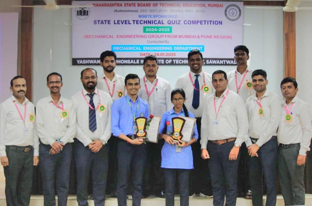 महाराष्ट्र राज्य तंत्रशिक्षण मंडळ पुरस्कृत राज्यस्तरीय टेक्निकल क्विझ कॉम्पिटिशन यशवंतराव भोसले इन्स्टिटयूट ऑफ टेक्नॉलॉजी येथे पार पडली. मेकॅनिकल शाखेच्या विद्यार्थ्यांसाठी आयोजित या स्पर्धेत मुंबई व पुणे विभागातील एकूण अठरा तंत्रनिकेतन संस्था सहभागी झाल्या होत्या. स्पर्धेचे उदघाटन संस्थेचे कार्याध्यक्ष अच्युत सावंतभोसले यांच्या हस्ते करण्यात आले. यावेळी प्राचार्य डॉ.रमण बाणे, उपप्राचार्य गजानन भोसले, शासकीय तंत्रनिकेतन, रत्नागिरीचे अधिव्याख्याता व परीक्षक अमोल धांडे, सचिन लांजेकर, मेकॅनिकल विभागप्रमुख अभिषेक राणे उपस्थित होते._