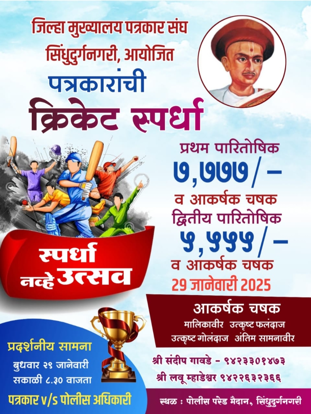 जिल्ह्यातील पत्रकारांना क्रिकेटच्या माध्यमातून एकत्र येवून एक दिवस आनंद लुटता यावा यासाठी सिंधुदुर्ग जिल्ह्यात सर्वप्रथम जिल्हा मुख्यालय पत्रकार संघाने ‘पत्रकारांची क्रिकेट स्पर्धा’ भरवण्याची संकल्पना सुरू करत ती यशस्वी केली. त्याच संकल्पनेनुसार मुख्यालय पत्रकार संघाच्यावतीने सिंधुदुर्गनगरी येथील पोलीस परेड मैदानावर चौथ्या वेळी २९ जानेवारी रोजी जिल्ह्यातील पत्रकारांसाठी एक दिवसीय टेनिस बॉल क्रिकेट स्पर्धा होत आहे. याचे उद्घाटन पालकमंत्री राणे यांच्याहस्ते होणार आहे. यावेळी जिल्हाधिकारी अनिल पाटील, जिल्हा पोलिस अधीक्षक सौरभ कुमार अग्रवाल, मुख्य कार्यकारी अधिकारी मकरंद देशमुख, जिल्हा बँक अध्यक्ष मनीष दळवी, भाजप जिल्हाध्यक्ष प्रभाकर सावंत, जिल्हा पत्रकार संघाचे अध्यक्ष उमेश तोरसकर यांच्यासह अन्य मान्यवर उपस्थित राहणार आहेत.
