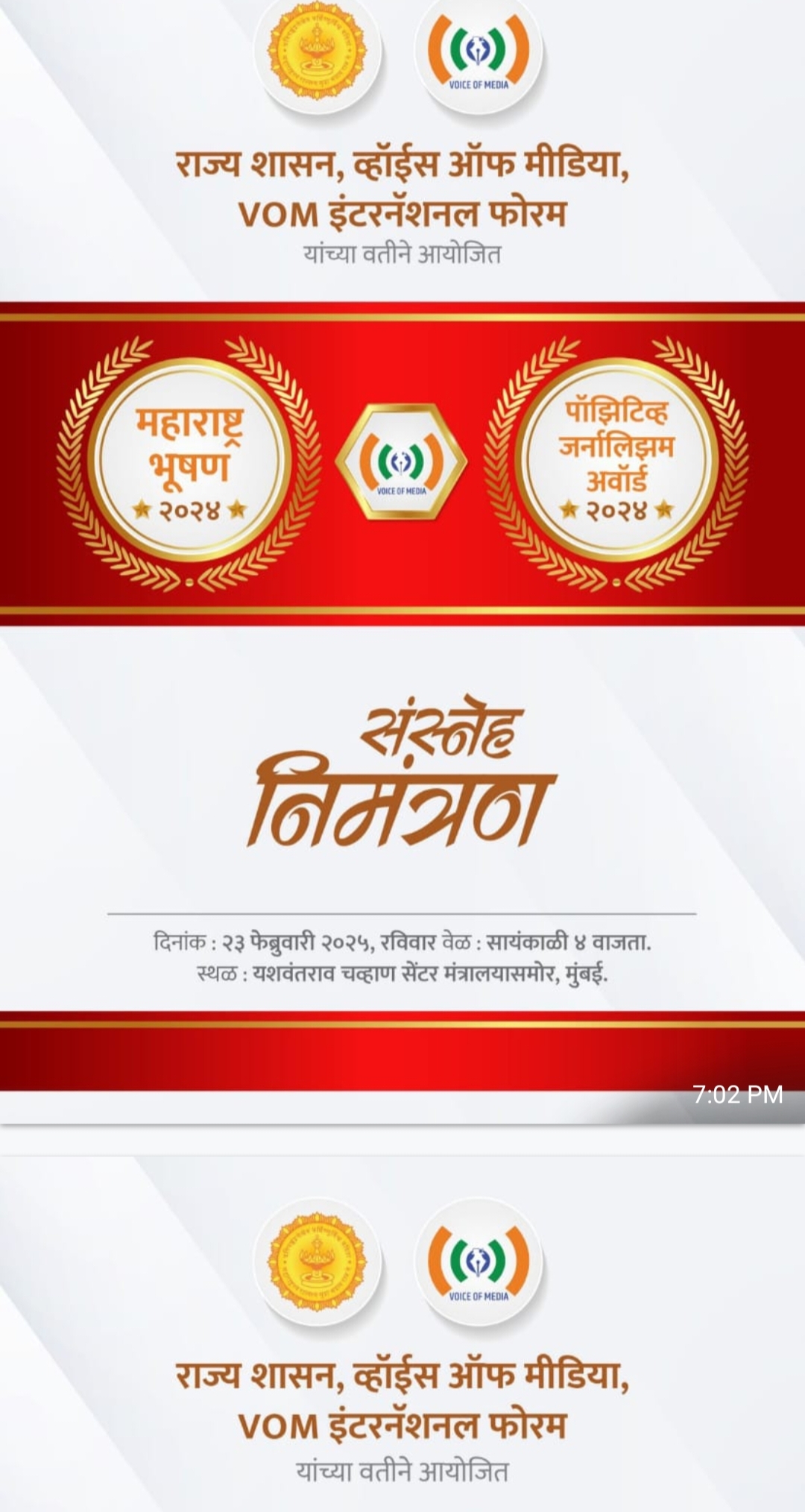 मुंबई (प्रतिनिधी): राज्य शासन, व्हॉईस ऑफ मीडिया आणि व्हीओएम इंटरनॅशनल फोरम यांच्या संयुक्त विद्यमाने ‘महाराष्ट्र भूषण २०२४’ व ‘व्हॉईस ऑफ मीडिया’ पॉझिटिव्ह जर्नालिझम अवॉर्ड २०२४ सोहळा, तसेच नवनिर्वाचित जिल्हाध्यक्षांचा सन्मान व पदग्रहण सोहळा २३ फेब्रुवारी २०२५ रोजी, रविवारी संध्याकाळी ४ वाजता, यशवंतराव चव्हाण सेंटर, मंत्रालयासमोर, मुंबई येथे आयोजित करण्यात आला आहे. या सोहळ्यास राज्यभरातून अनेक पत्रकार, पदाधिकारी उपस्थित राहणार आहेत.