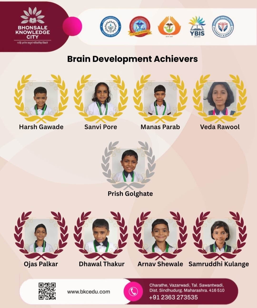 ब्रेन डेव्हलपमेंट स्कॉलरशिप परीक्षेत यशवंतराव भोसले इंटरनॅशनल स्कुलच्या विद्यार्थ्यांनी चमकदार कामगिरी करत सुयश प्राप्त केले. परीक्षेला शाळेतून शंभर विद्यार्थी बसले होते आणि सर्वच्या सर्व उत्तीर्ण झाले. यामध्ये इयत्ता दुसरीची विद्यार्थिनी सान्वी संतोष पोरे हिने सिंधुदुर्ग जिल्ह्यात प्रथम येण्याचा मान पटकावला.