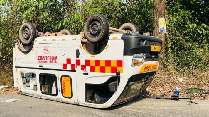 रस्त्यात गाय आडवी आल्याने रूग्णवाहिका पलटी