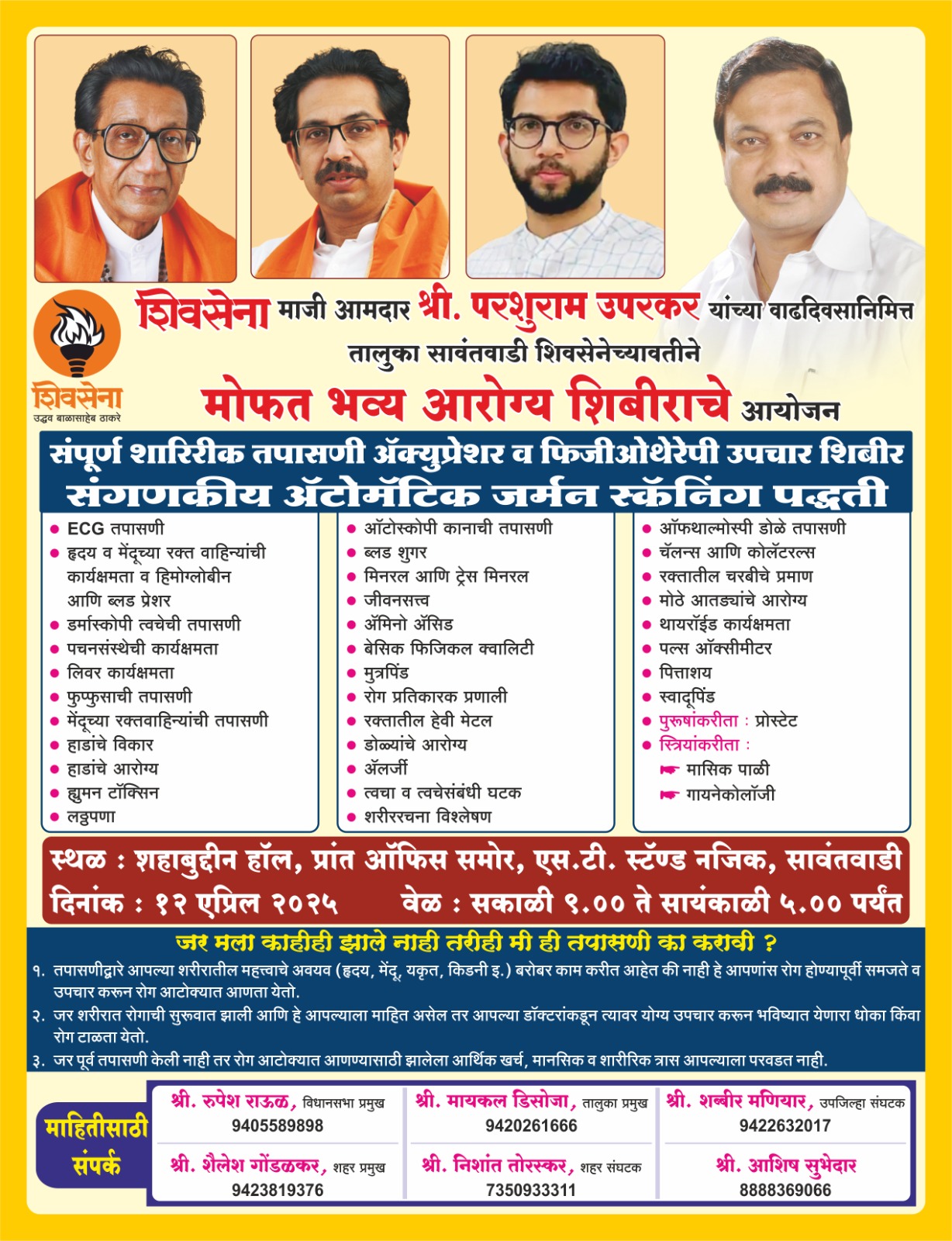 माजी आमदार व शिवसेना उध्दव बाळासाहेब ठाकरे पक्षाचे नेते परशुराम उपरकर यांच्या वाढदिवसानिमित्त 12 एप्रिल रोजी सकाळी 9 ते सायंकाळी 5 वाजेपर्यंत सावंतवाडी काजी शहाबुद्दीन सभागृहात येथे मोफत भव्य आरोग्य शिबीर आयोजित केले आहे.या शिबीरात संपूर्ण शारिरीक तपासणीसह अॅक्युप्रेशर व फिजीओथेरेपी उपचार हे संगणकीय अॅटोमॅटिक जर्मन स्कॅनिंग पद्धतीने करण्यात येणार आहे.