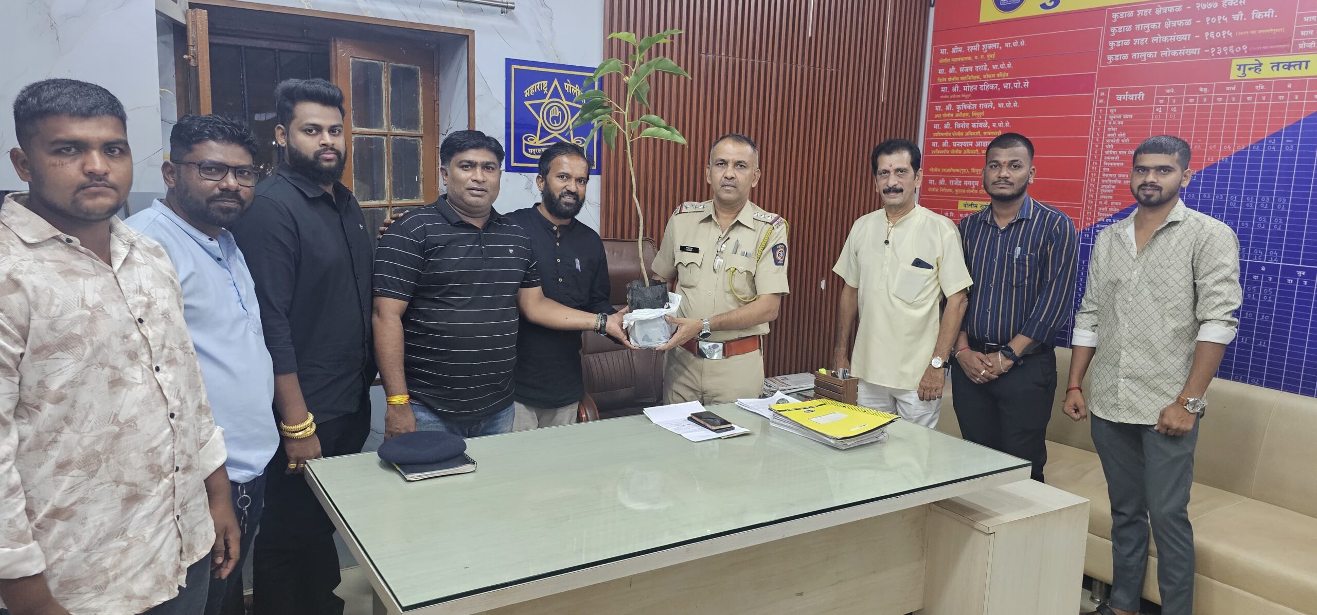 तालुक्यातील विविध ठिकाणच्या सात घरफोड्या, दरोडे ,चोरी करणाऱ्या आरोपीस जेरबंद व बिडवलकर खुन प्रकरणात योग्य तपास करणाऱ्या कुडाळ पोलीस निरीक्षक श्री. मगदूम व सह कर्मचाऱ्यांचे जिल्हाध्यक्ष धीरज परब यांच्या नेतृत्वाखाली मनसे कडुन अभिनंदन करण्यात आले. याप्रसंगी त्यांना सुगंधी चाफा फुलाचे वृक्ष देऊन सन्मानित करण्यात आले.