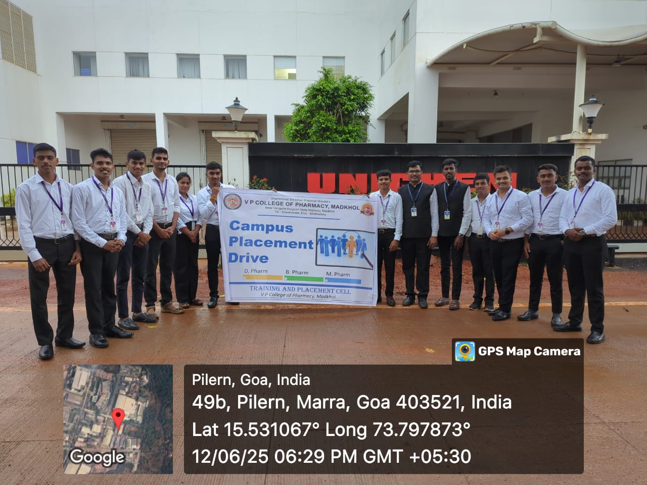 व्ही पी कॉलेज ऑफ फार्मसी माडखोल मध्ये 31 मे 2025 रोजी महाविद्यालयात ट्रेनिंग अँड प्लेसमेंट सेल अणि युनीकेम लॅबोरेटरीस, गोवा यांचे मार्फत कॅम्पस प्लेसमेंट ड्राईव्ह आयोजित करण्यात आला होता. या प्लेसमेंट ड्राईव्ह मध्ये बी. फार्मसी 2024-25 मधील अंतिम वर्षाच्या अकरा विद्यार्थ्यांची प्रोडक्शन डिपार्टमेंट, पाच विद्यार्थ्यांची क्वालिटी कंट्रोल डिपार्टमेंट आणि आठ विद्यार्थांची क्वालिटी अश्युरन्स डिपार्टमेंट मध्ये निवड झाली. कॅम्पस प्लेसमेंट ड्राईव्ह साठी समन्वयक म्हणून सह प्राध्यापक योगेश पुजारी आणि सह प्राध्यापिका नीलम सावंत यांनी विशेष परिश्रम घेतले.