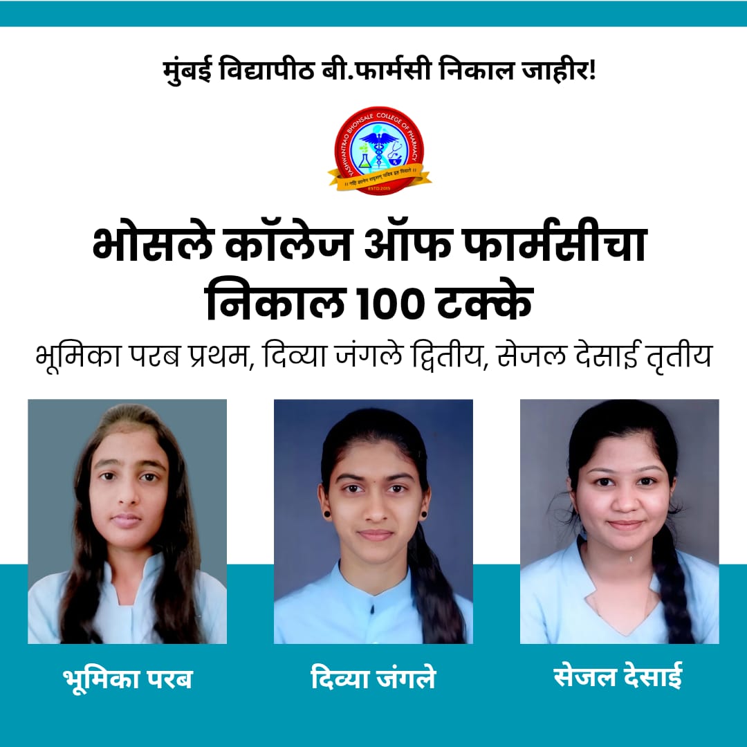 मुंबई विद्यापीठाच्या बी.फार्मसी अंतिम वर्ष परीक्षेचा निकाल नुकताच जाहीर झाला असून यशवंतराव भोसले कॉलेज ऑफ फार्मसीने १०० टक्के निकालाची परंपरा यंदाही कायम ठेवली आहे. परीक्षेला कॉलेजचे एकूण १२६ विद्यार्थी बसले होते. त्यापैकी सर्वच्या सर्व उत्तीर्ण झाले. यात भूमिका मंगेश परब हिने ९.०९ एसजीपीए गुणांसह प्रथम, दिव्या जनार्दन जंगले हिने ८.९१ गुणांसह द्वितीय तर सेजल दत्तात्रय देसाई हिने ८.६४ गुणांसह तृतीय क्रमांक मिळवला. विद्यार्थ्यांच्या या यशाबद्दल संस्थेचे कार्याध्यक्ष अच्युत सावंतभोसले, प्राचार्य डॉ.विजय जगताप, परीक्षा विभाग प्रमुख प्रा.नमिता नार्वेकर, प्रा.प्रणाली जोशी यांनी त्यांचे अभिनंदन केले व पुढील वाटचालीसाठी शुभेच्छा दिल्या.