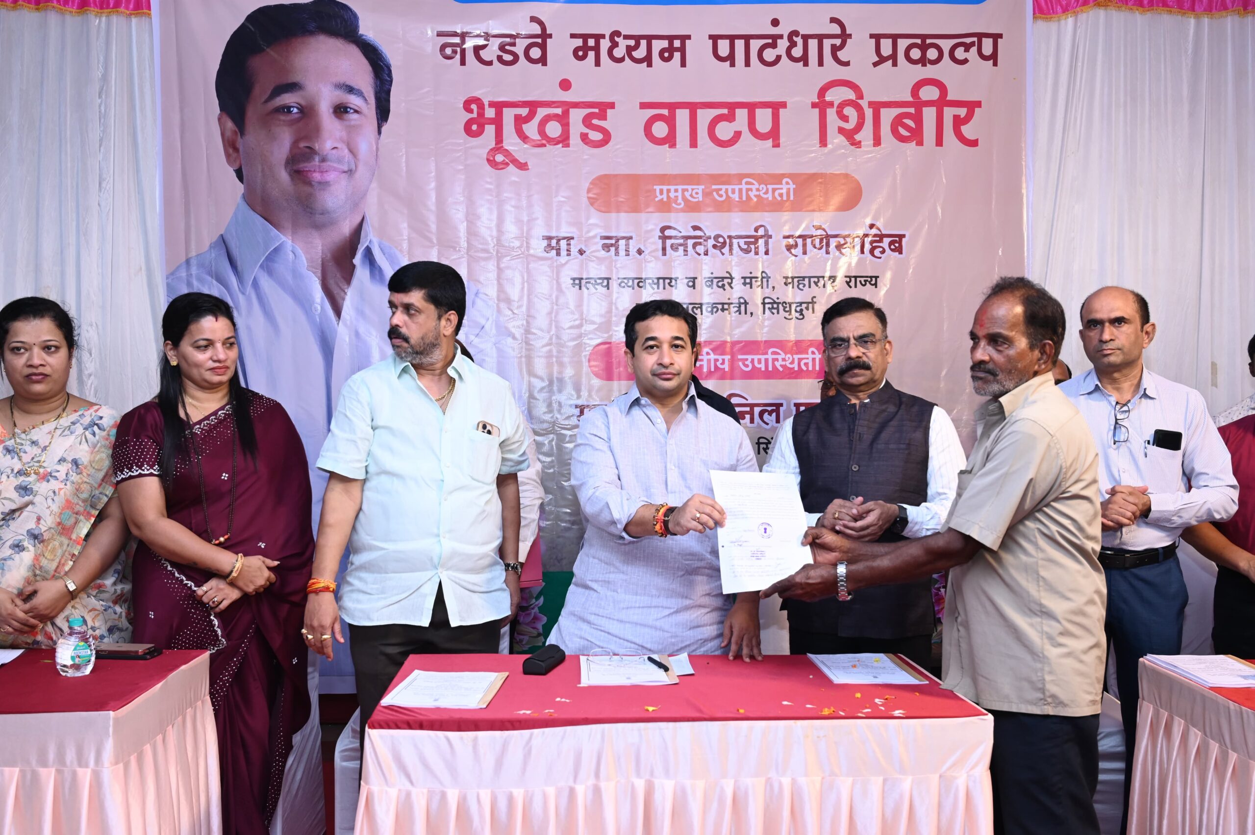 नरडवे प्रकल्पग्रस्तांना शासनाकडून देण्यात आलेल्या भूखंड वाटपाच्या प्रमाणपत्रांचे वितरण पालकमंत्री नितेश राणे यांच्या हस्ते करण्यात आले. यावेळी जिल्हाधिकारी अनिल पाटील, अपर जिल्हाधिकारी शुभांगी साठे, अधीक्षक अभियंता पद्माकर पाटील, प्रांताधिकारी जगदीश कातकर, जिल्हा पुनर्वसन अधिकारी शितल जाधव, कार्यकारी अभियंता विनायक जाधव, तहसिलदार दिक्षांत देशपांडे, माजी जिल्हा परीषद अध्यक्ष संदेश सावंत, माजी जिल्हा परीषद अध्यक्ष संजना सावंत तसेच सरपंच आणि ग्रामस्थ उपस्थित होते. यावेळी जयराम बापू ढवळ, विष्णू नामदेव ढवळ, श्रीधर सखाराम पालव, अनंत आपा ढवळ, प्रकाश धोंडू ढवळ, लवू गणपत तेजम, अशोक सिताराम चव्हाण, संतोष शिवराम सावंत, आनंद विठ्ठल ढवळ, जॉन अंतोन डिसोजा, प्रभाकर यशवंत ढवळ आदींना भूखंड वाटपाचे प्रमाणपत्र देण्यात आले.