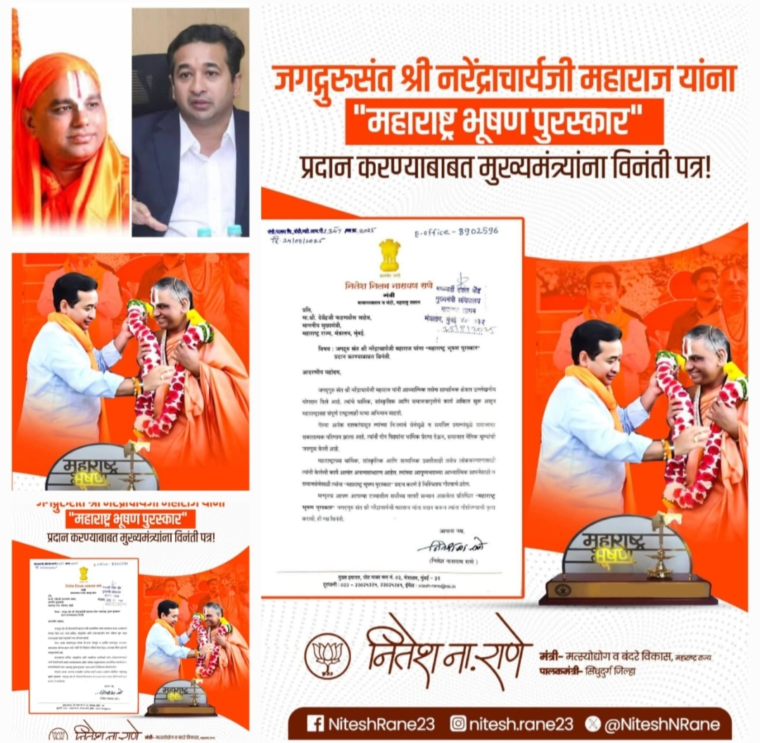 जगद्गुरू रामानंदाचार्यजी नरेंद्राचार्यजी यांना महाराष्ट्राचा सर्वोच्च नागरी सन्मान असलेला ‘महाराष्ट्र भूषण पुरस्कार’ प्रदान करण्याची विनंती मुख्यमंत्री देवेंद्र फडणवीस यांच्याकडे राज्याचे मत्स्यव्यवसाय आणि बंदरे मंत्री नितेश राणे यांनी केली आहे.