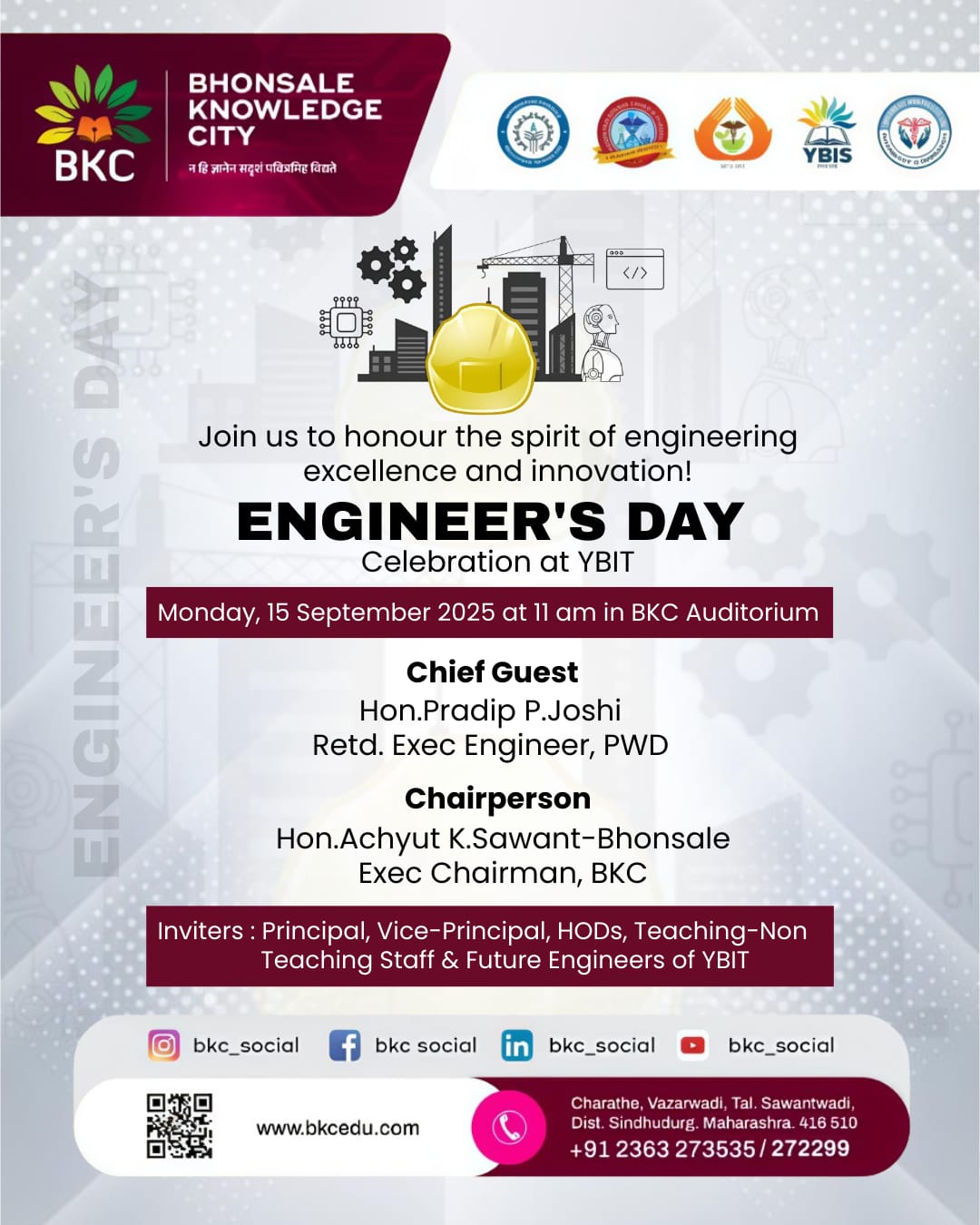 “फादर ऑफ इंजिनियरिंग” भारतरत्न डॉ.मोक्षगुंडम विश्वेश्वरय्या यांच्या जयंतीनिमित्त दरवर्षी १५ सप्टेंबर रोजी साजरा होणारा अभियंता दिन यावर्षीही भोसले नॉलेज सिटीमध्ये मोठ्या उत्साहात साजरा करण्यात येणार आहे. विशेष म्हणजे, यंदा या कार्यक्रमाचे अकरावे वर्ष आहे. सोमवारी सकाळी ११ वा.बीकेसी सभागृहात हा कार्यक्रम संपन्न होईल. प्रमुख अतिथी म्हणून सार्वजनिक बांधकामचे नि.कार्यकारी अभियंता प्रदीप जोशी उपस्थित राहणार असून, भोसले नॉलेज सिटीचे कार्याध्यक्ष अच्युत सावंत भोसले अध्यक्षस्थानी असतील.