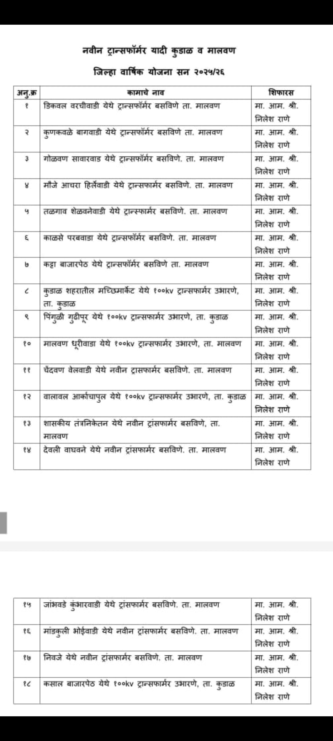 कुडाळ व मालवण तालुक्यातीसाठी एकूण १८ ट्रान्सफार्मरच्या कामांना मंजुरी देण्यात आली असून यात डिकवल वरचीवाडी, कुणकवळे बागवाडी, गोळवण सावरवाड, आचरा हिर्लेवाडी, तळगाव शेळवणेवाडी, काळसे परबवाडी, कट्टा बाजारपेठ, कुडाळ मच्छीमार्केट, पिंगुळी गुढीपुर, मालवण धुरीवाडा, चेंदवन वेलवाडी, वालावल आर्कचापूल, शासकीय तंत्रनिकेतन, देवली वाघवणे, जांभवडे कुंभारवाडी, मांडकुली भोईवाडी, निवजे, कसाल बाजारपेठ, आंबेरी गोसावीवाडी, वेताळ बांबर्डे कदम वाडी, या कमी दाबाने वीजपुरवठा होणाऱ्या भागात नवीन ट्रान्सफार्मरसाठी निधी मंजूर करण्यात आला आहे. या बाबातची माहिती शिवसेना जिल्हाप्रमुख दत्ता सामंत यांनी दिली असून आमदार निलेश राणे यांच्या जवळ कुडाळ मालवण तालुक्यातील जनतेच्या मागणीनुसार हे ट्रान्सफार्मर मंजूर करण्यात आले आहेत. विज यंत्रणा अधिक सक्षम करण्यासाठी आमदार निलेश राणे हे तत्पर असून येत्या काळात उर्वरित कामांना मंजुरी मिळणार आहे.