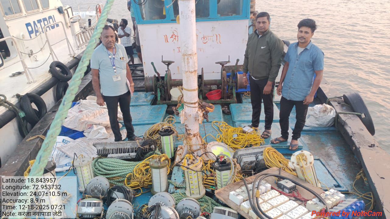 महाराष्ट्र राज्याच्या सागरी हद्दीत अनधिकृत LED व्दारे मासेमारी करणाऱ्या रायगड जिल्हयातील 02 मासेमारी नौकांवर दिनांक 17.12.2025 रोजी व दिनांक 18.12.2025 रोजी रात्राी 02:10 वाजता मत्स्यव्यवसाय विभागाकडून गस्ती नौकेव्दारे कारवाई करण्यात आली. श्री. जगन्नाथ माया कोळी, रा. राममंदीर केळवणे, ता. पनवेल यांच्या मालकीच्या साई गणेश क्र. IND-MH-7-MM-1318 ही नौका दिनांक 17.12.2025 रोजी खदेरीच्या समोरील समुद्रात रात्री 09:30 वाजता 10 वावात अनधिकृत LED पध्दतीने मासेमारी करीता असताना मत्स्यव्यवसाय विभागाच्या गस्ती नौकेद्वारे पकडण्यात आली. तसेच दि.17.12.25 रोजी रात्री 11.00 वाजता अलिबाग समोरील समुद्रात 12 वावात मासेमारी करीत असताना श्री. यशवंत गणपत नाखवा रा.साखरकोळीवाडा पो.आक्षी ता.अलिबाग जि.रायगड यांच्या मालकीची हेरंब कृपा IND-MH-3-MM-4194 ही नौका अनिधकृत एलएईडी पध्दतीने मासेमारी करीत असताना मत्स्यव्यवसाय विभागाच्या गस्ती नौकेद्वारे पकडण्यात आली.तसेच दि.18.12.25 रोजी सकाळी 6 वाजता श्री.प्रकाश तुकाराम पाटील रा.करंजा ता.उरण जि.रायगड यांची मासेमारीनौका श्रीसमर्थ कृपा क्रं.IND-MH-7-MM-3627 या नौकेची विभागाच्या गस्तीनौकेवरून तपासणी केली असता सदर नौकेत 1) 4000 वॅटचे अंडर वॉटर एलएईडीचे लाईटचे चार नग २) 3000 वॅटचे अंडर वॉटर एलएईडीचे लाईटचे तीन नग 3) 2500 वॅटचे अंडर वॉटर एलएईडीचे लाईटचे एक नग 4) सीया लाईट 1000 वॅटचे 16 नग ५) चारशे वॅटचे 2 नग हॅलोजन बल्ब ६) एक जनरेटर असे अनिधकृत एलएईडी मासेमारी करण्याचे साहित्य पकडण्यात आले आहे.