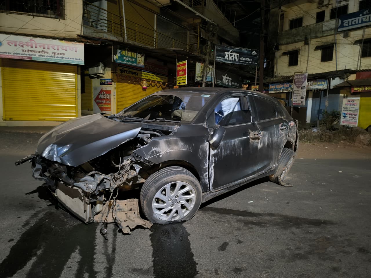 कुडाळ शहरात मध्यरात्री घडलेल्या एका थरारक घटनेने संपूर्ण परिसर हादरून गेला. लुटीचा प्रयत्न करून पलायन करणाऱ्या भरधाव बलेनो कारचा गीता हॉटेलसमोरील मुख्य रस्त्यावर भीषण अपघात झाला. अनियंत्रित झालेल्या कारने रस्त्यालगतच्या दुकानांना जोरदार धडक देत रस्त्यावर उभ्या असलेल्या एका कारलाही ठोकर दिली. या अपघातात बलेनो कारसह उभी वॅनगार कार आणि एका दुकानाचे मोठ्या प्रमाणात नुकसान झाले आहे.