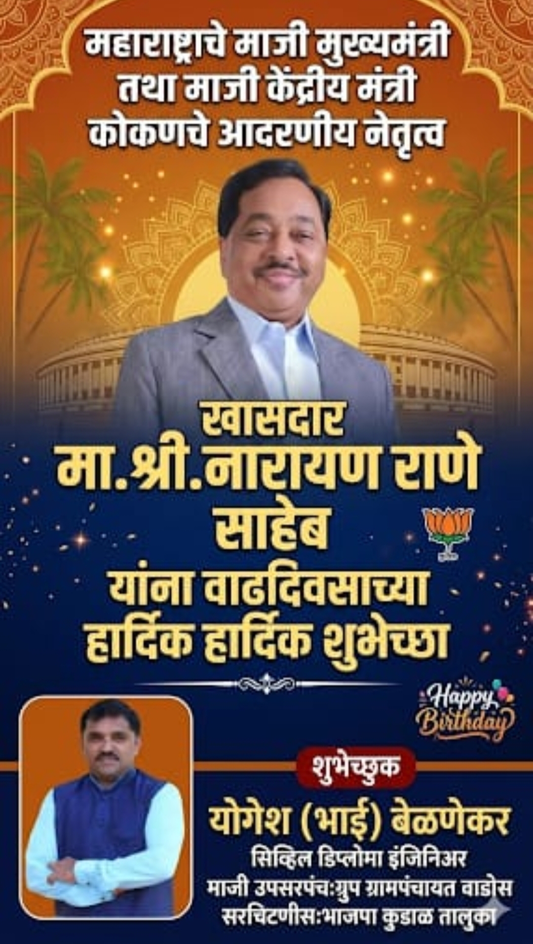 सिंधुदुर्ग-रत्नागिरी मा.श्री. खासदार नारायणराव राणे साहेब वाढदिवसाच्या हार्दिक शुभेच्छा
