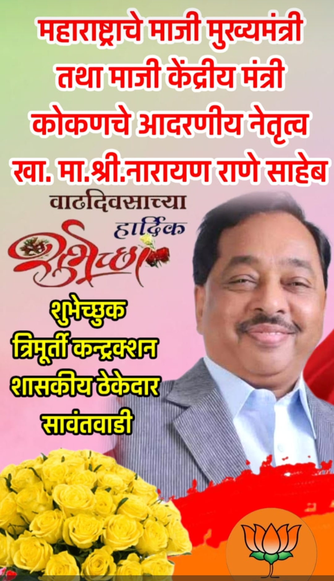 महाराष्ट्राचे माजी मुख्यमंत्री तथा माजी केंद्रीय मंत्री कोकणचे आदरणीय नेतृत्व खासदार मा.श्री.नारायण राणे साहेब यांना वाढदिवसाच्या हार्दिक हार्दिक शुभेच्छा
