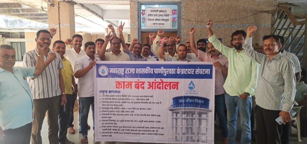 महाराष्ट्र राज्य शासकीय पाणीपुरवठा कंत्राटदार संघटनेच्या नेतृत्वाखाली आज कार्यकारी अभियंता ग्रामीण पाणीपुरवठा विभाग सिंधुदुर्ग यांच्या कार्यालयासमोर गेले दोन वर्षापासून जलजीवन मिशनच्या कामासाठी शासनाकडून पुरेसा निधी मिळत नसल्याने काम करणे अवघड बनले आहे यामुळे जिल्ह्यातील कंत्राटदारांनी आजपासून काम बंद आंदोलन पुकारले आहे.