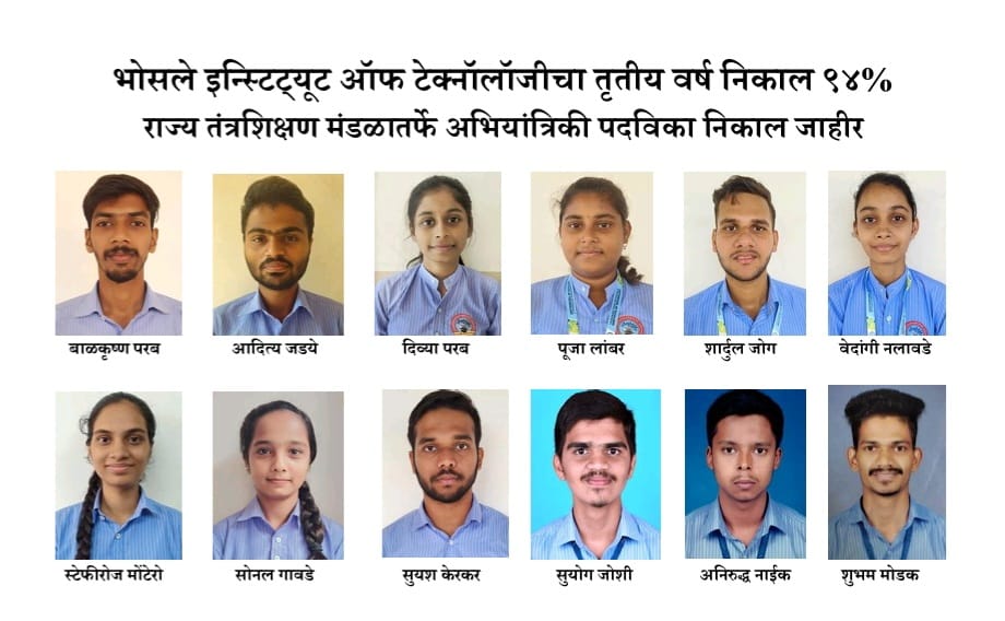 महाराष्ट्र राज्य तंत्रशिक्षण मंडळातर्फे पदविका अभियांत्रिकी परीक्षेचा निकाल जाहीर करण्यात आला असून येथील यशवंतराव भोसले इन्स्टिट्यूट ऑफ टेक्नॉलॉजीचा निकाल ९४ टक्के लागला आहे. तृतीय वर्ष पदविका अभियांत्रिकी परीक्षेसाठी कॉलेजमधून एकूण २०४ विद्यार्थी बसले होते. त्यापैकी १९१ विद्यार्थी उत्तीर्ण झाले आहेत._