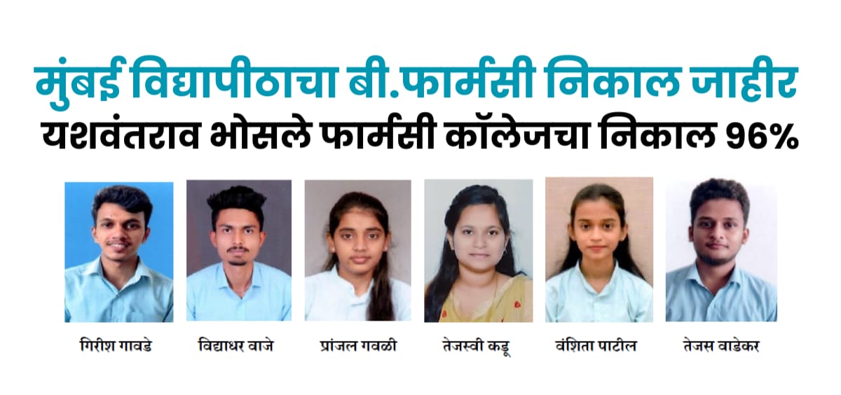 मुंबई विद्यापीठाने बी.फार्मसी परीक्षेचा निकाल जाहीर केला असून येथील यशवंतराव भोसले कॉलेज ऑफ फार्मसीचा निकाल ९६ टक्के एवढा लागला आहे.