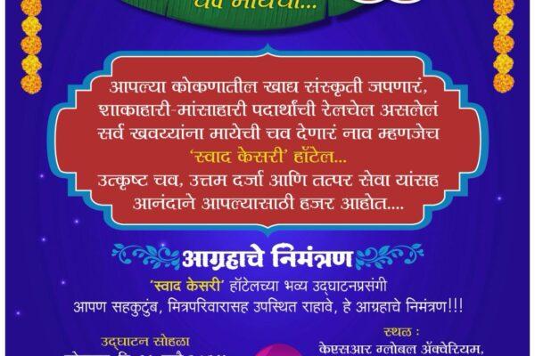 सावंतवाडी प्रतिनिधीकोकणातील खाद्य संस्कृती जपणारं, शाकाहारी- मांसाहारी पदार्थांची रेलचेल असलेलं सर्व खवय्यांना मायेची चव देणारे स्वाद केसरी…चव मायेची या हॉटेलचे भव्य उदघाटन येत्या १५ जुलै २०२४ रोजी सौ. सुहासी रविंद्र चव्हाण यांच्या हस्ते सावंतवाडी येथे होणार आहे.सावंतवाडी तालुक्यातील केसरी येथे केएसआर ग्लोबल अँक्वेरियम येथे सुरु करण्यात येणारे स्वाद केसरी हॉटेलचे उद्घाटन सोमवार , १५ जुलै…