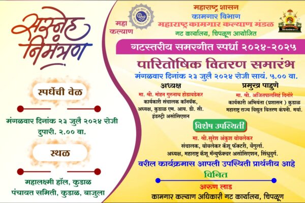 महेंद्र पेडणेकर:आपल्या कामगार वर्गाने लाभ घेतल्यास खूप साऱ्या योजनेचा फायदा होऊ शकतो कुडाळ प्रतिनिधीमहाराष्ट्र शासन कामगार विभाग महाराष्ट्र कामगार कल्याण मंडळ. विभाग ठाणे गट चिपळूण अंतर्गत कामगार कल्याण केंद्र, कुडाळ, महालक्ष्मी हॉल येथे दिनांक 23 /07/2024 रोजी गटस्तरीय समरगीत स्पर्धा 2024-25 आयोजित करण्यात आली. कार्यक्रमाचे प्रास्ताविक कामगार कल्याण अधिकारी अरुण लाड साहेबांनी कामगार कल्याणच्या माध्यमातून…