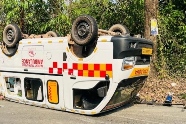 रस्त्यात गाय आडवी आल्याने रूग्णवाहिका पलटी