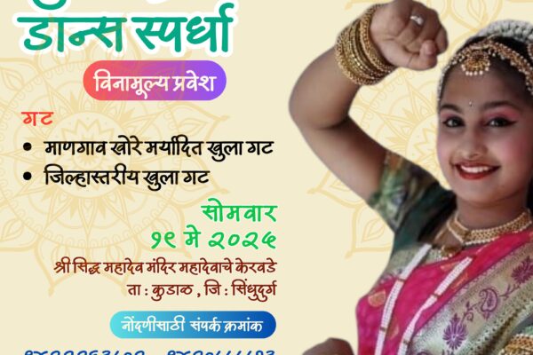शिवतेज ग्रुप महादेवाचे केरवडे मार्फत आयोजन कुडाळ प्रतिनिधी महादेवाचे केरवडे येथील प्रसिद्ध श्री सिद्ध महादेव मंदिर यात्रे निमित्ताने १९ मे २०२५ रोजी शिवतेज ग्रुप महादेवाचे केरवडे मार्फत खुल्या जिल्हास्तरीय एकेरी रेकॉर्ड डान्स स्पर्धेचे आयोजन करण्यात आलेले आहे. सदर स्पर्धा ही दोन गटात भरविण्यात आलेली आहे. जिल्हास्तरीय खुला गट आणि माणगाव खोरे मर्यादित खुला गट जिल्हास्तरीय…